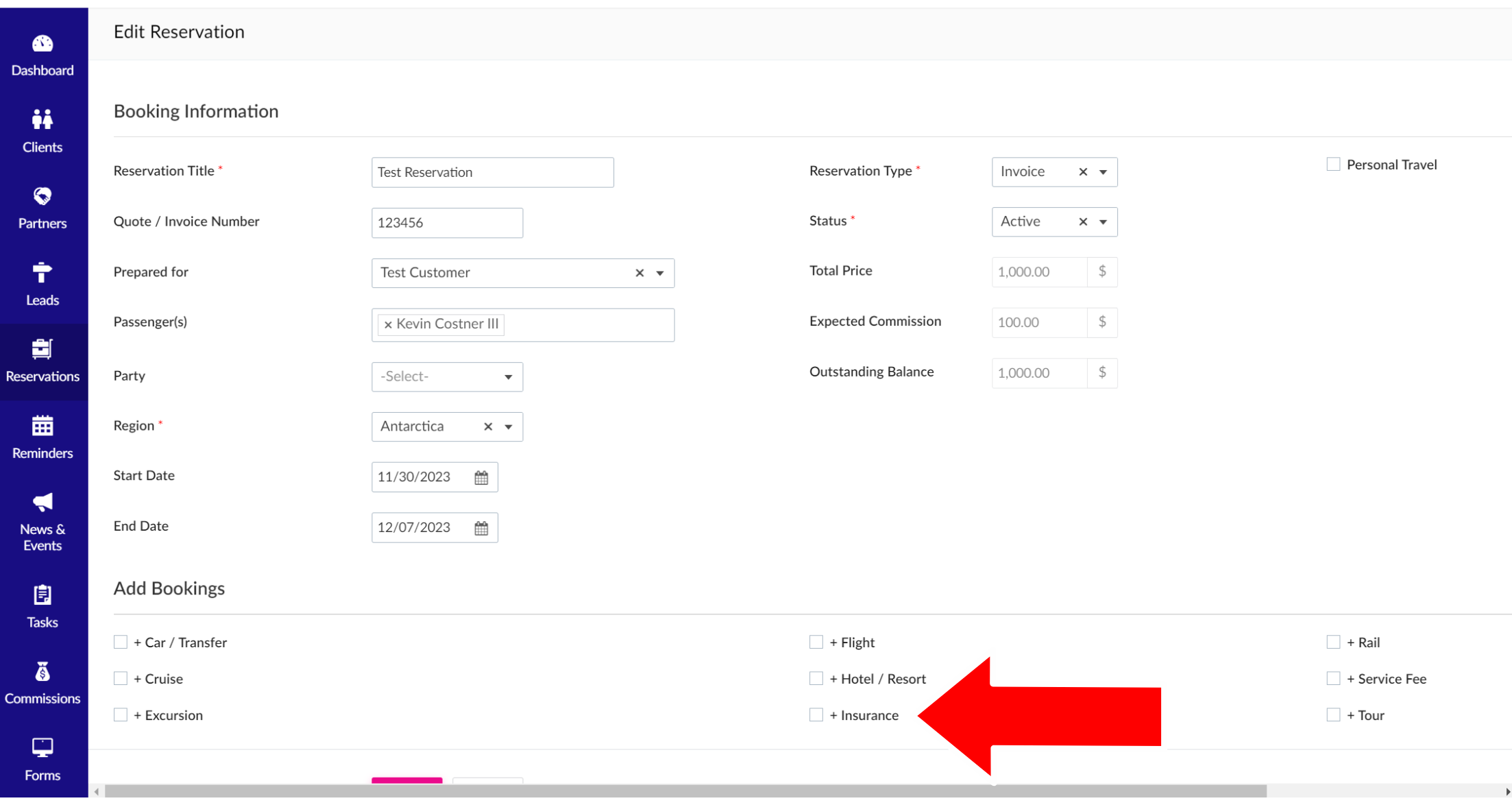 4. Scroll down to the "Add Bookings" section and click the box next to "+Insurance" in the middle of the section.