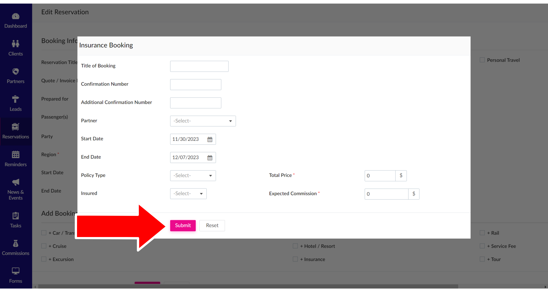 5. A pop-up will appear. Enter the Insurance information in each field. A pink asterisk will notate required fields, including: Total Price and Expected Commission. When finished, click the pink "Submit" button at the bottom.