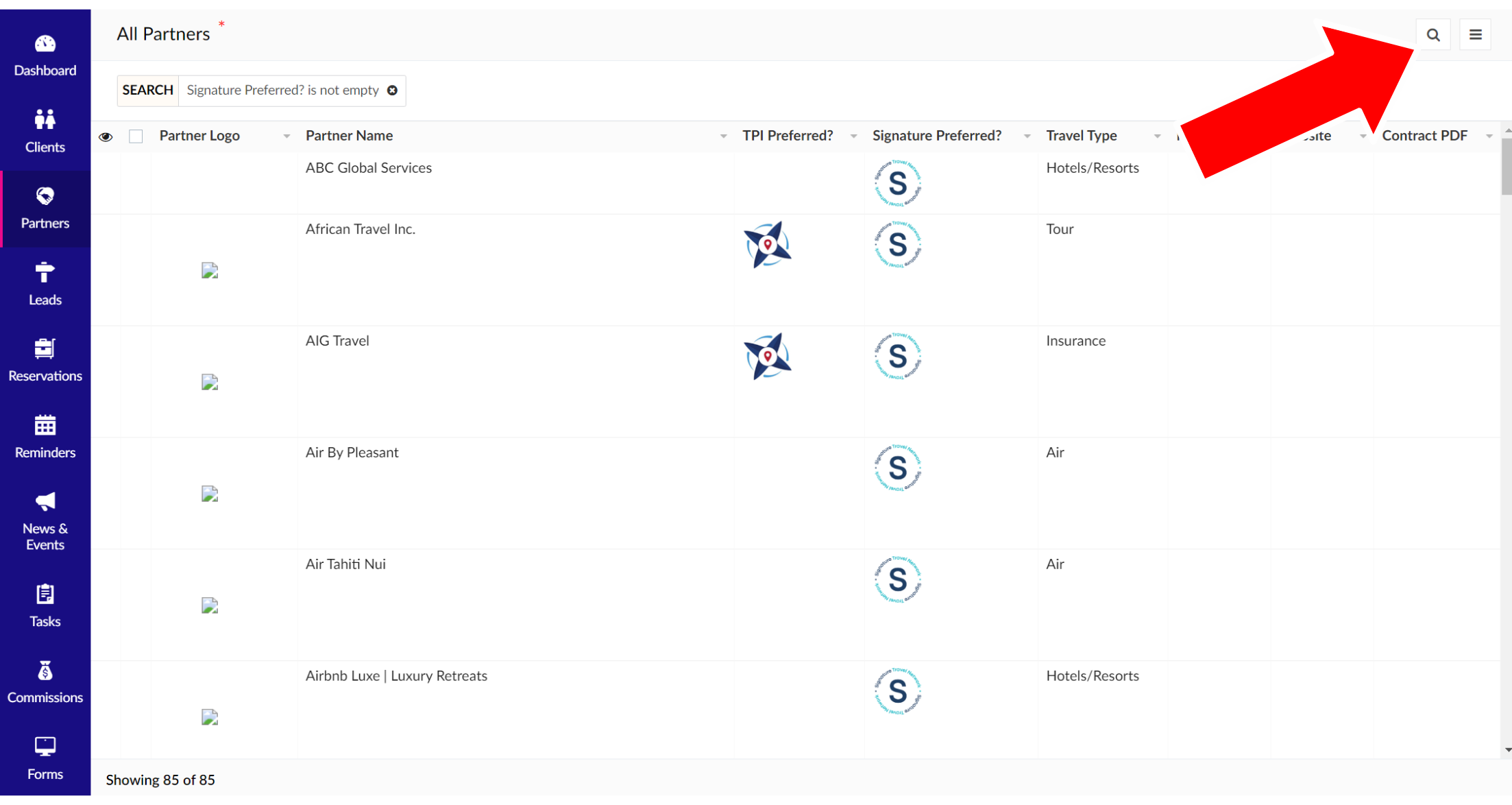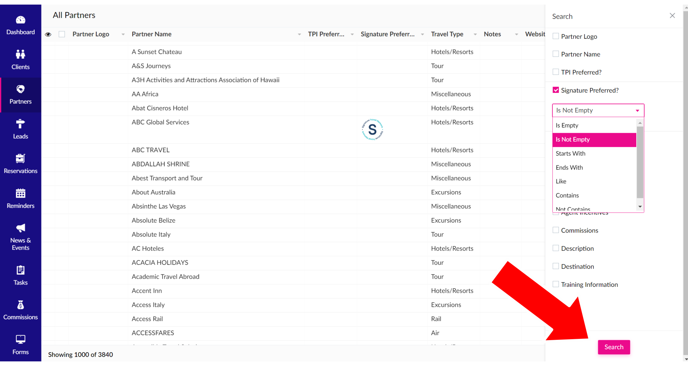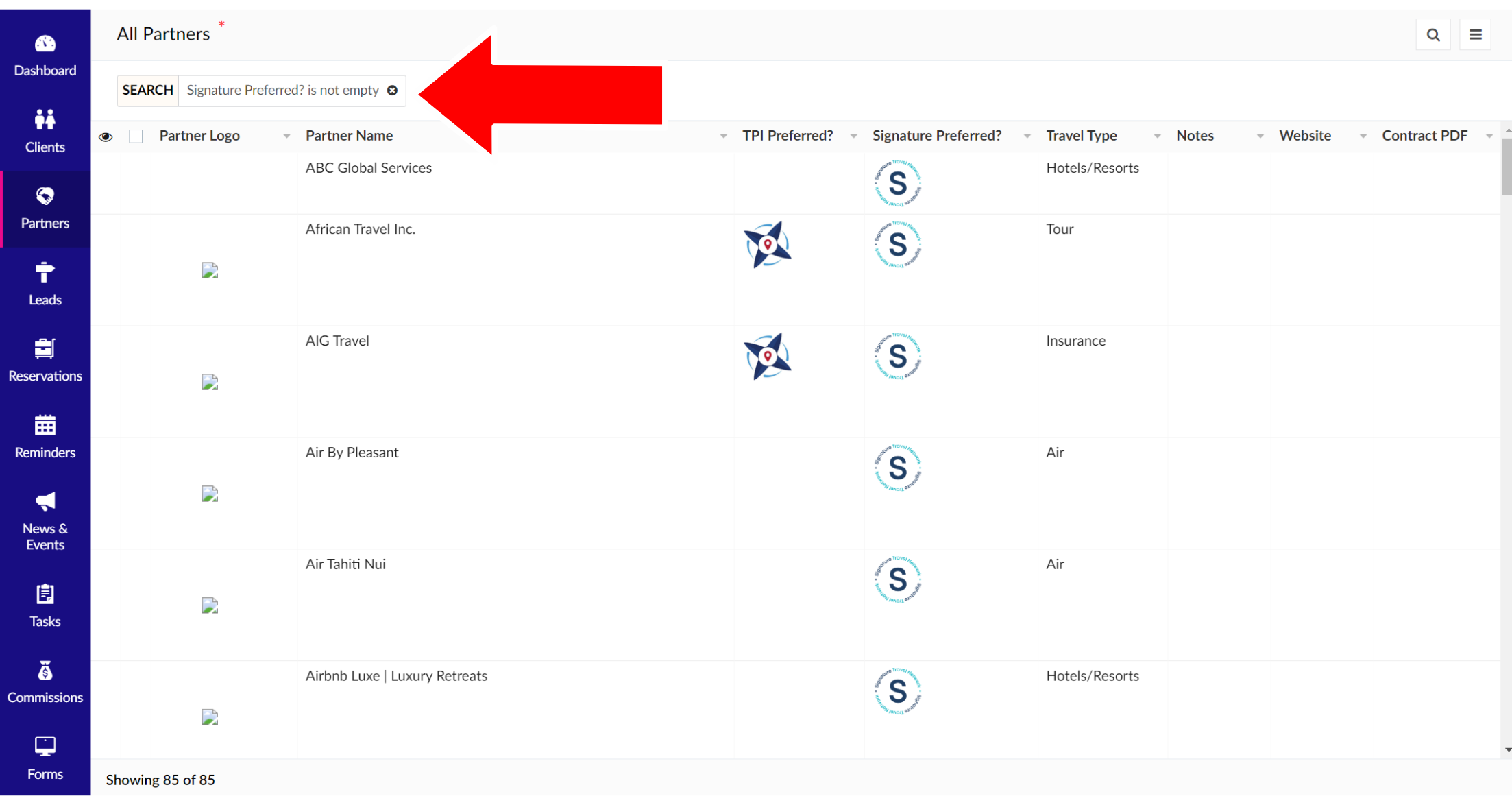 3. To Filter for only Signature Partners in this column, click the small gray arrow next to "Signature Preferred?" and click "Search".